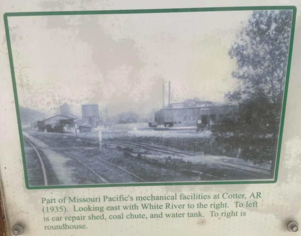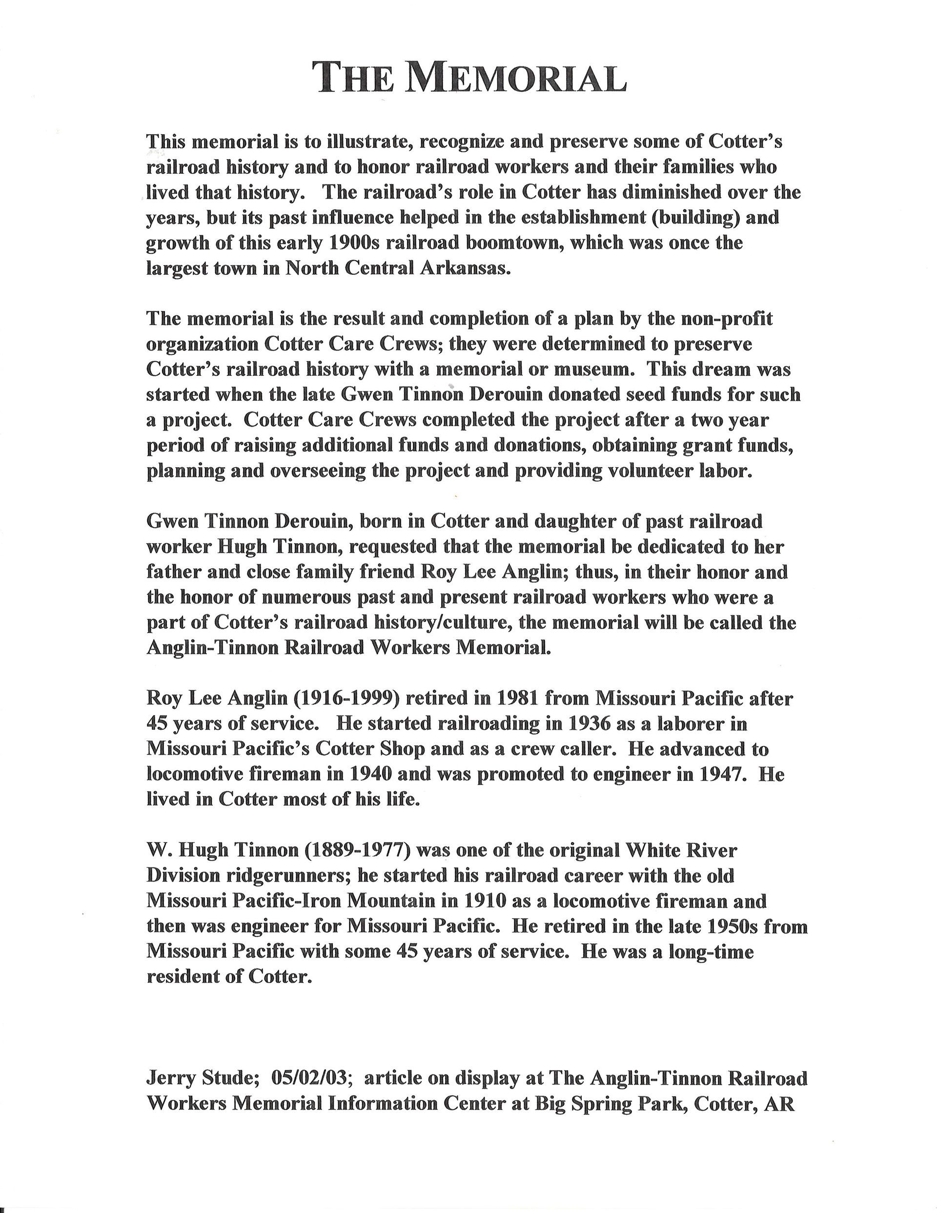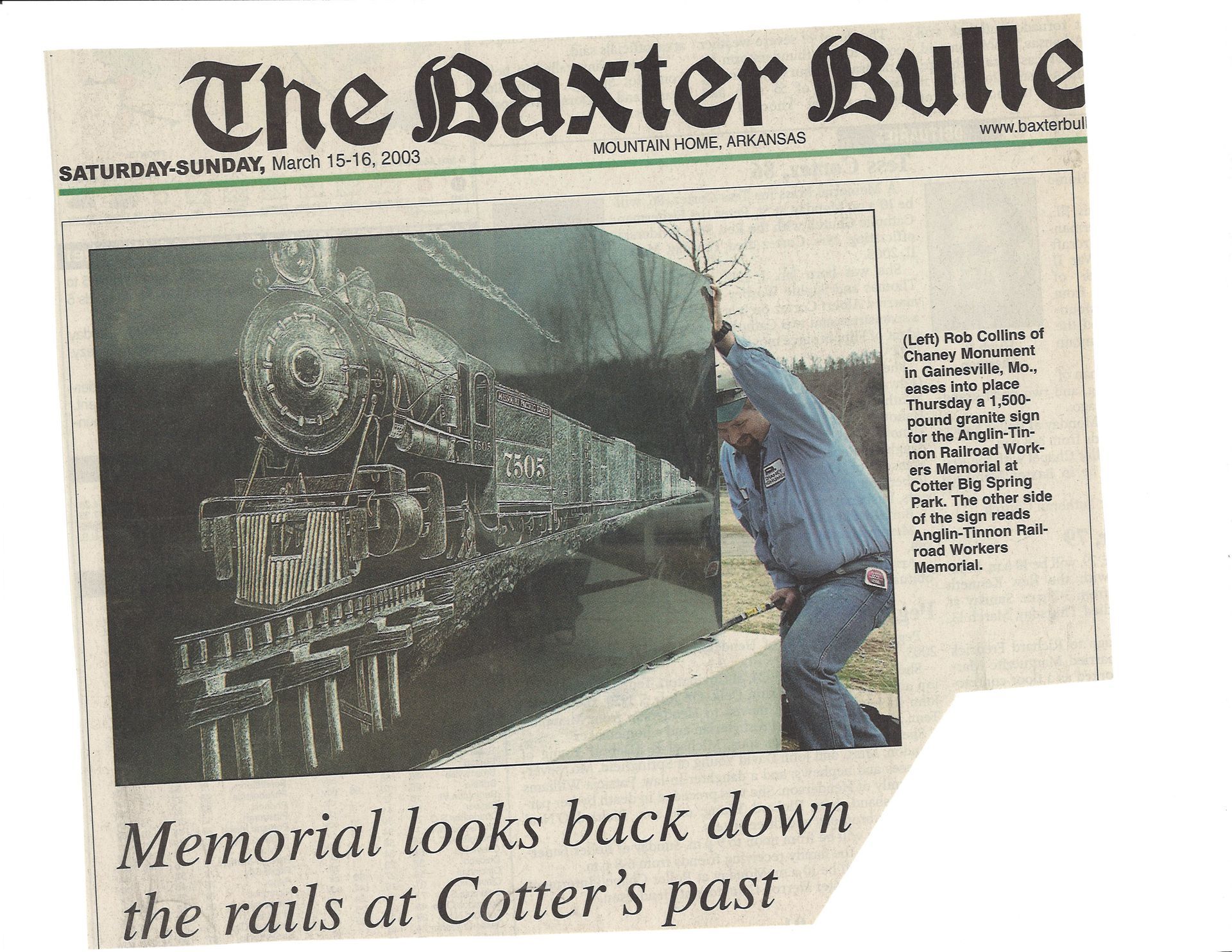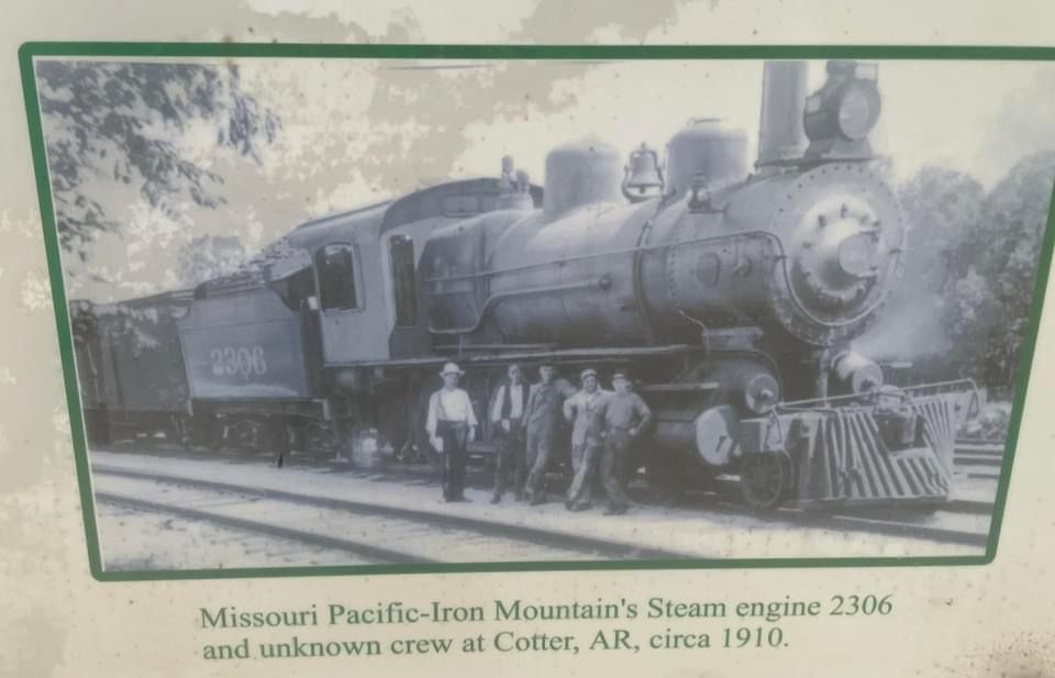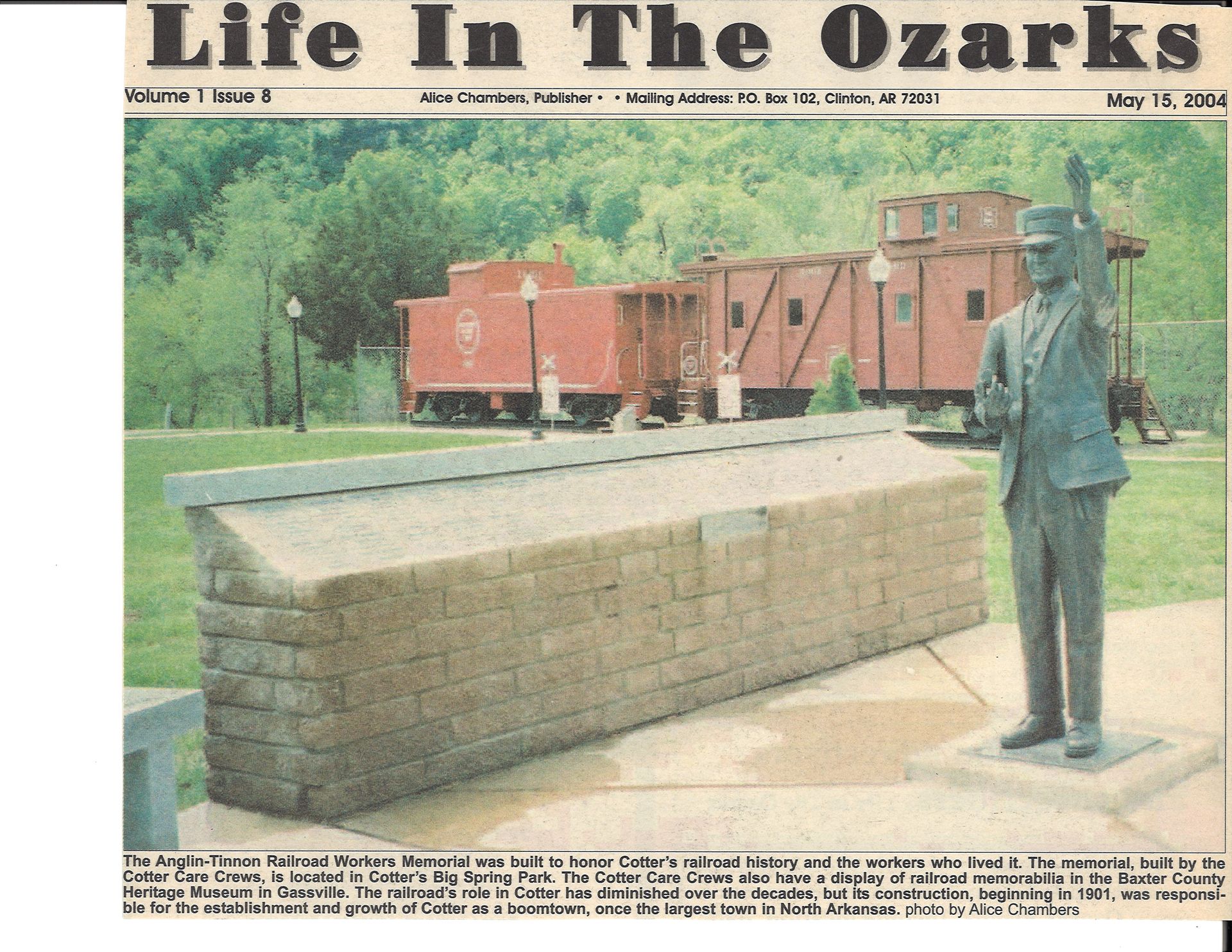 The Anglin-Tinnon Railroad Workers Memorial honors Cotter’s railroad history and the workers who lived it. At the entrance to the memorial grounds is a black granite monument that highlights the founders and four railroad emblems: Missouri Pacific Iron Mountain, Missouri Pacific, Union Pacific, and M&NA (Missouri and North Arkansas); an engraving of a locomotive is on the back.