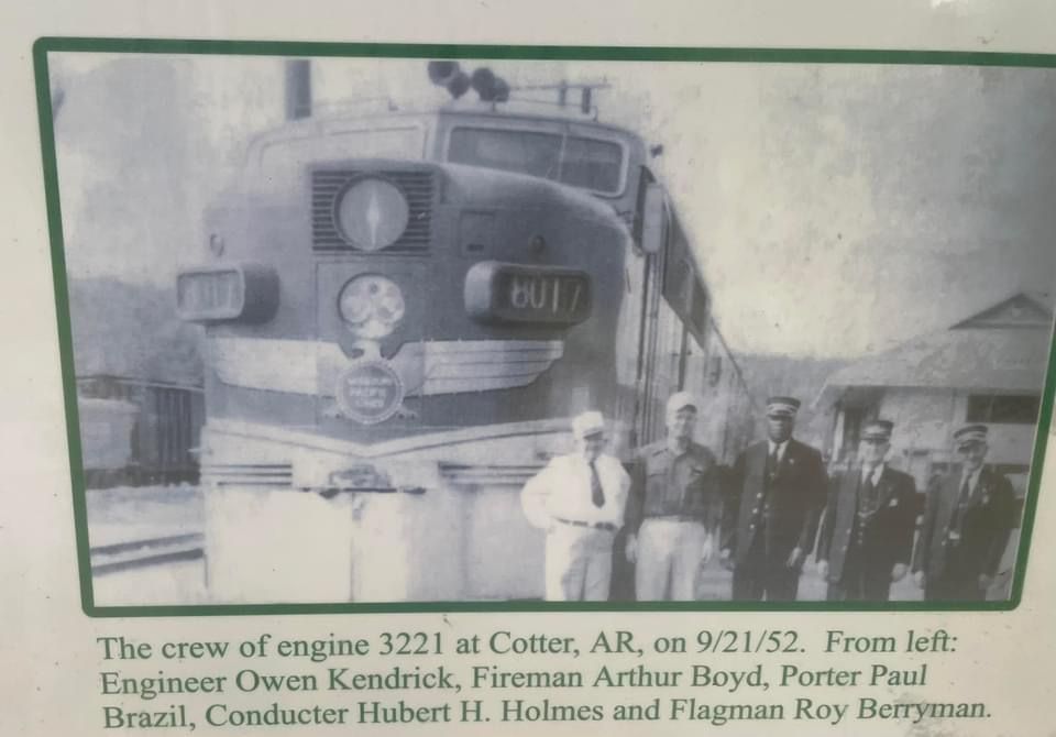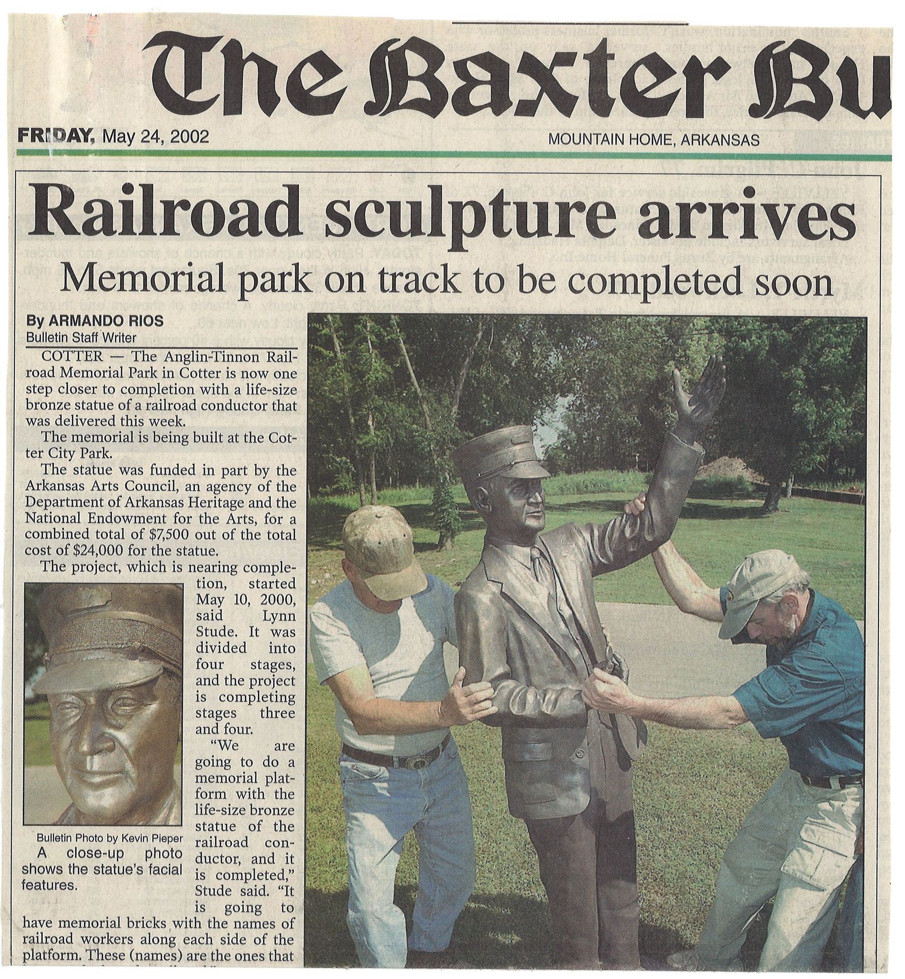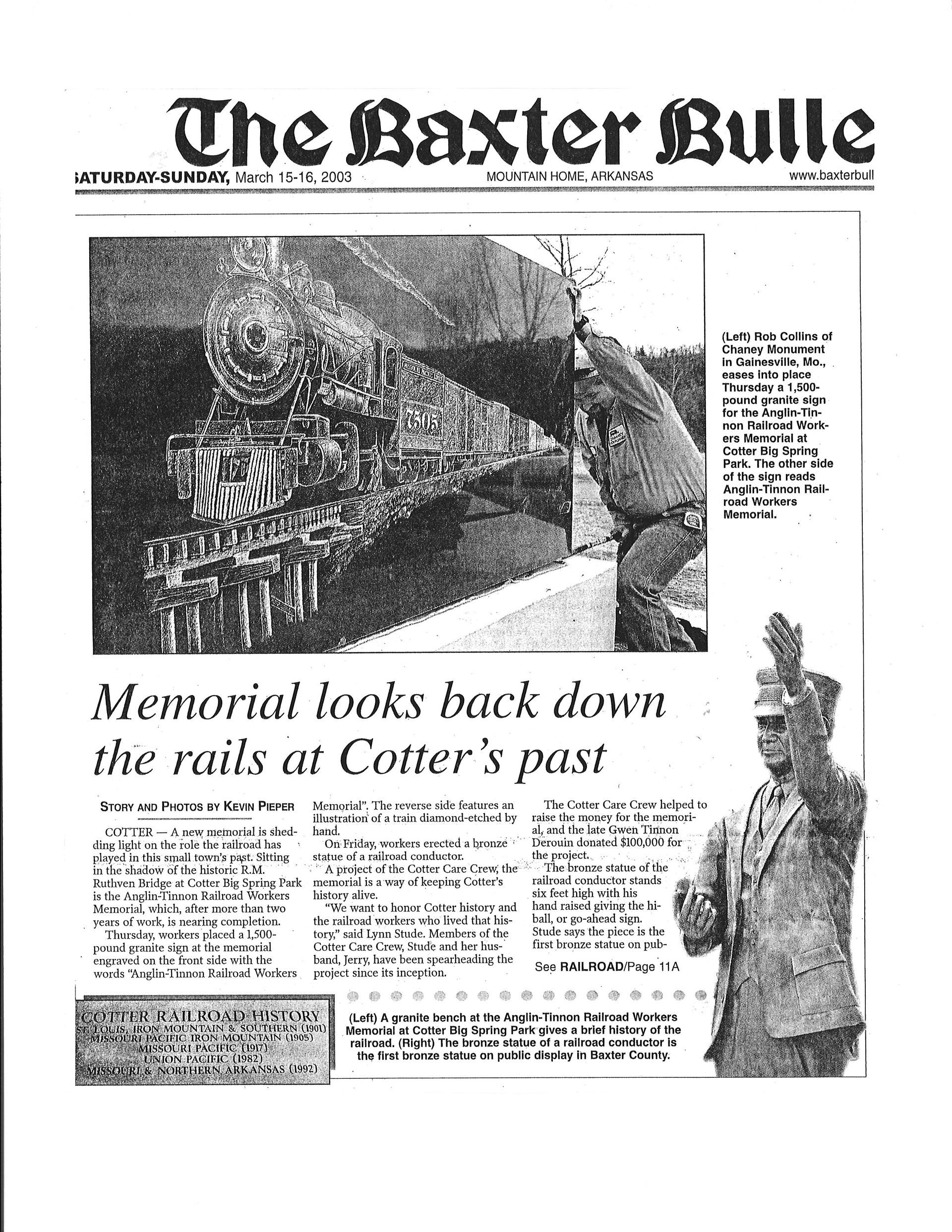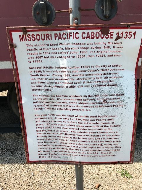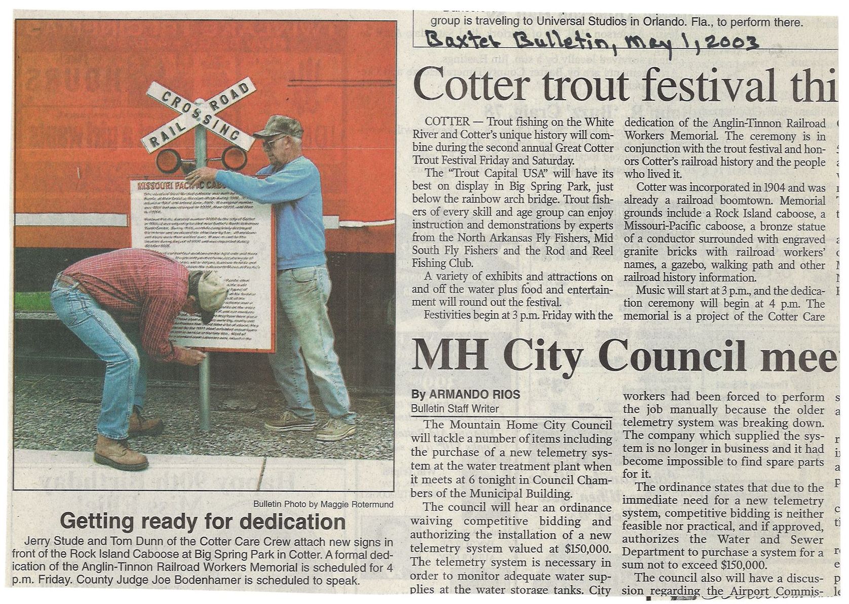 The Anglin-Tinnon Railroad Workers Memorial honors Cotter’s railroad history and the workers who lived it. At the entrance to the memorial grounds is a black granite monument that highlights the founders and four railroad emblems: Missouri Pacific Iron Mountain, Missouri Pacific, Union Pacific, and M&NA (Missouri and North Arkansas); an engraving of a locomotive is on the back.