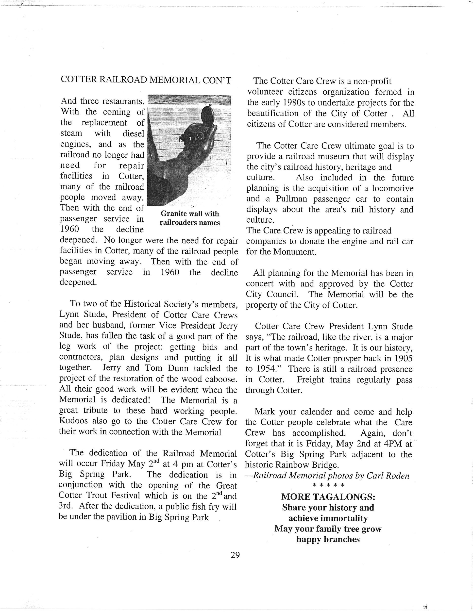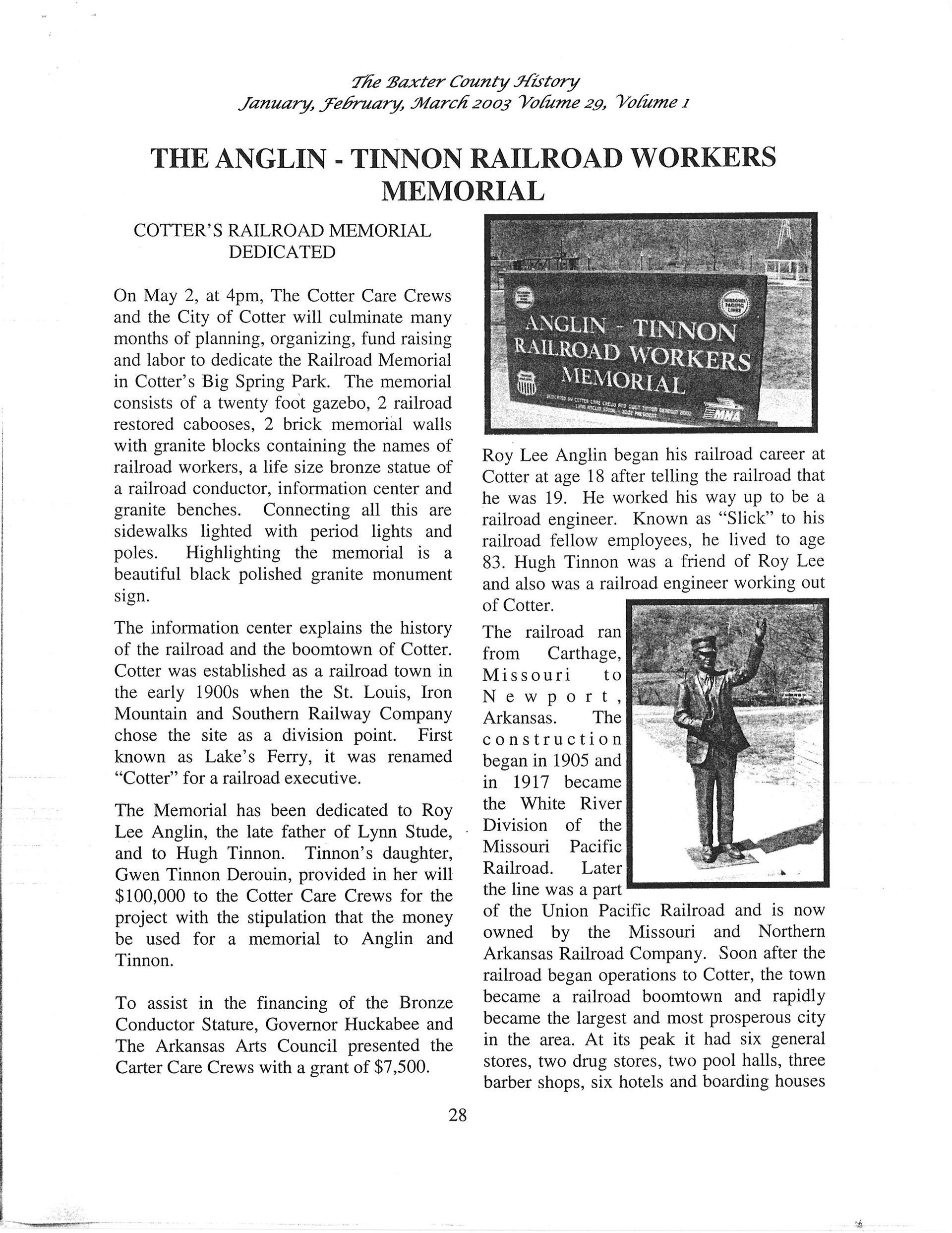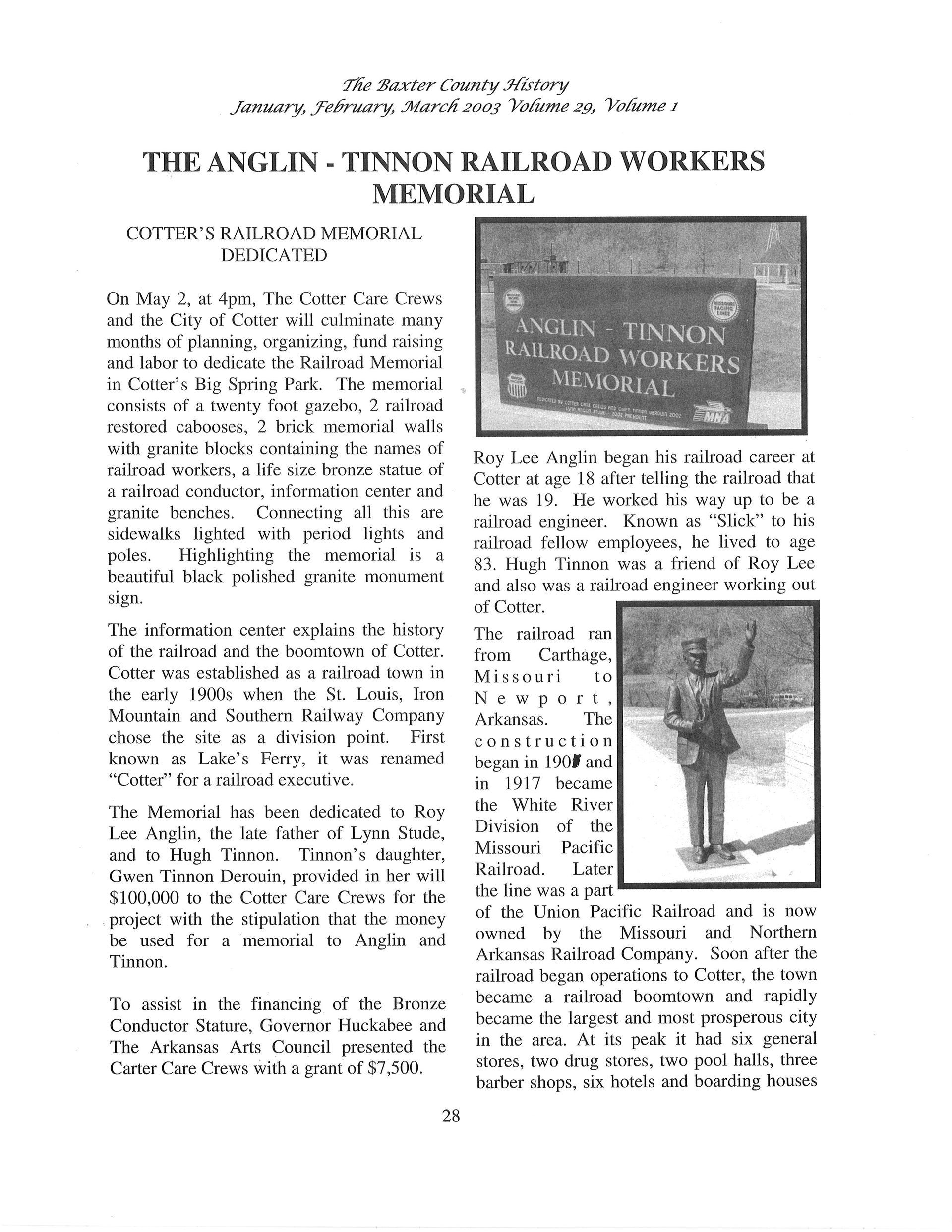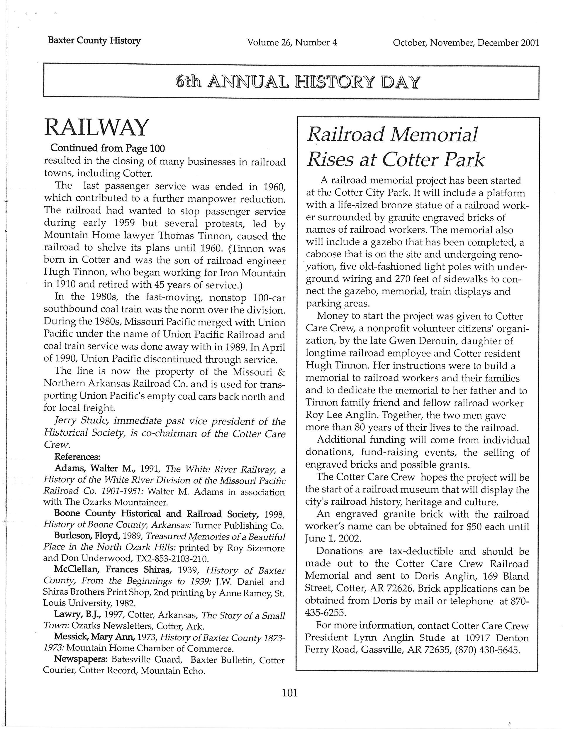 The Anglin-Tinnon Railroad Workers Memorial honors Cotter’s railroad history and the workers who lived it. At the entrance to the memorial grounds is a black granite monument that highlights the founders and four railroad emblems: Missouri Pacific Iron Mountain, Missouri Pacific, Union Pacific, and M&NA (Missouri and North Arkansas); an engraving of a locomotive is on the back.