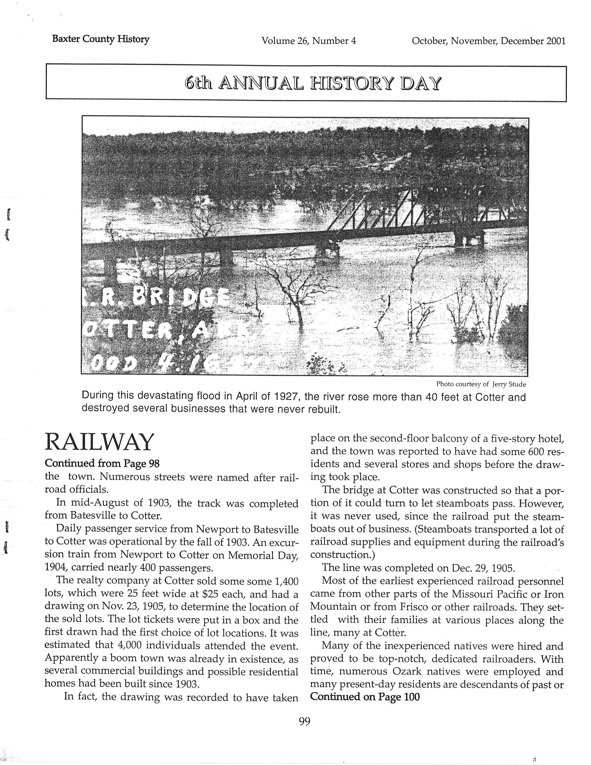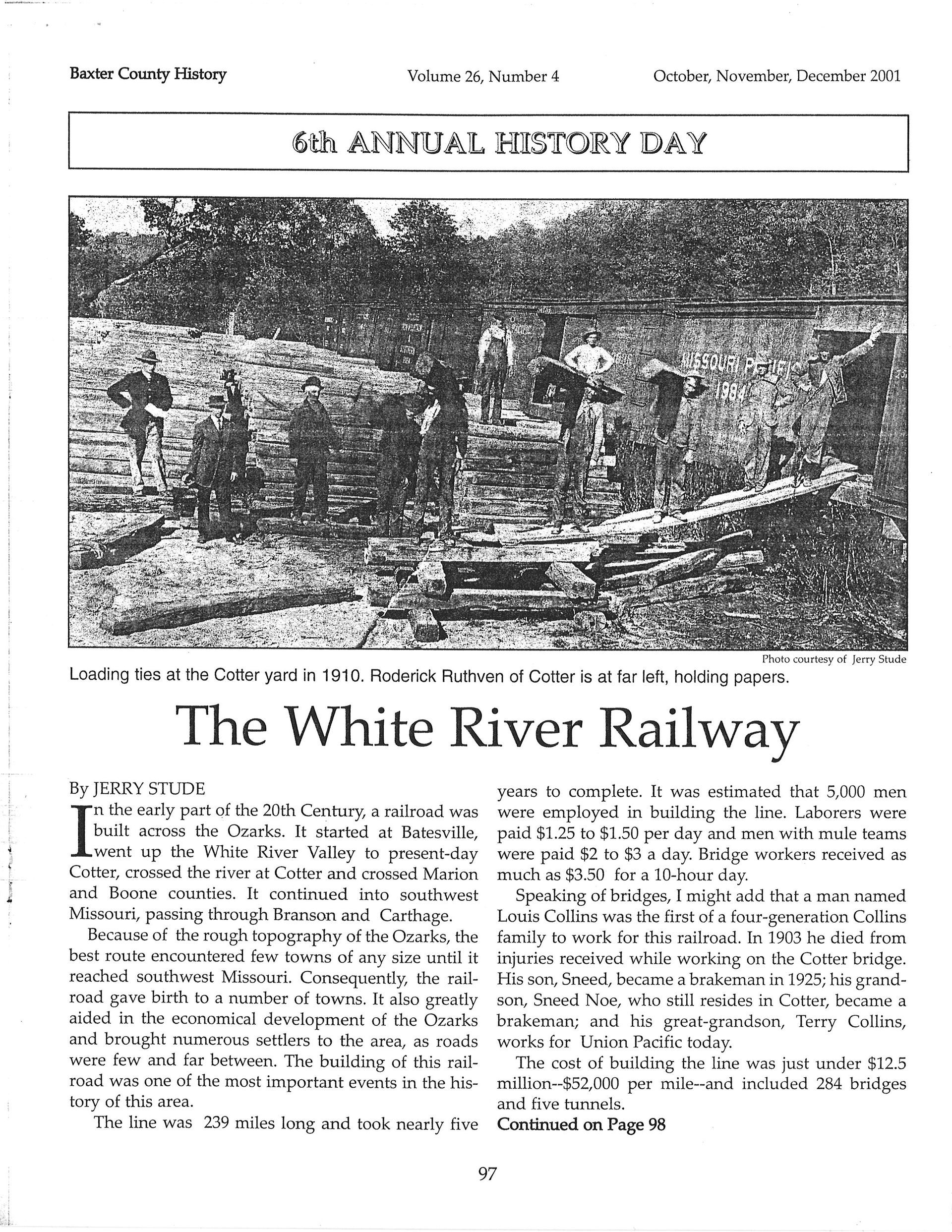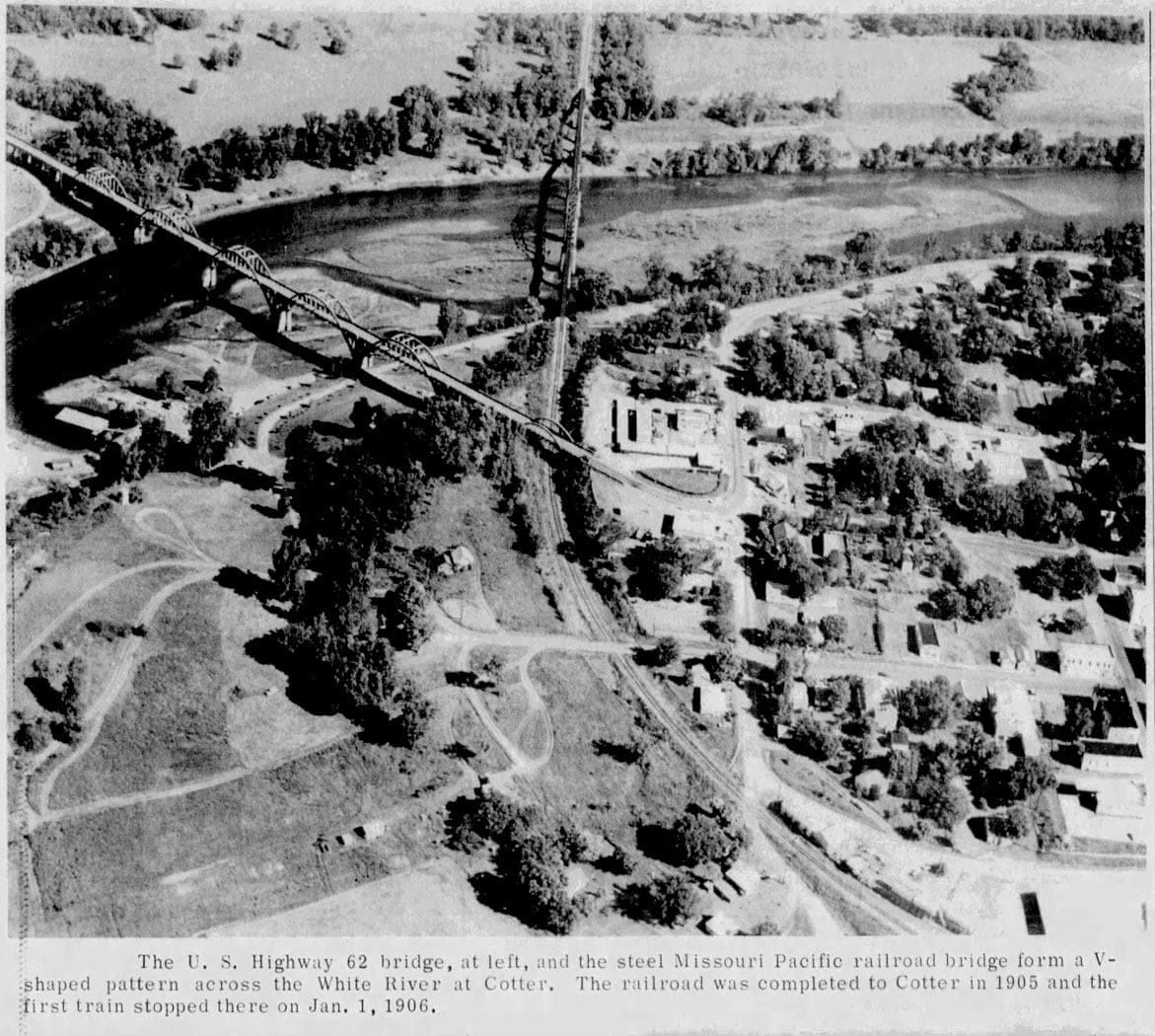 The true birth of Cotter was driven by the arrival of the St. Louis, Iron Mountain & Southern Railroad, which later became part of the Missouri Pacific system. As the railroad laid tracks between Newport and Carthage, Missouri, the White River in Baxter County proved to be an ideal central location for a division point. The town was named in 1904 to honor William Cotter, a civil engineer and Railroad Manager on the project. The official opening of the City of Cotter followed on November 23, 1905.