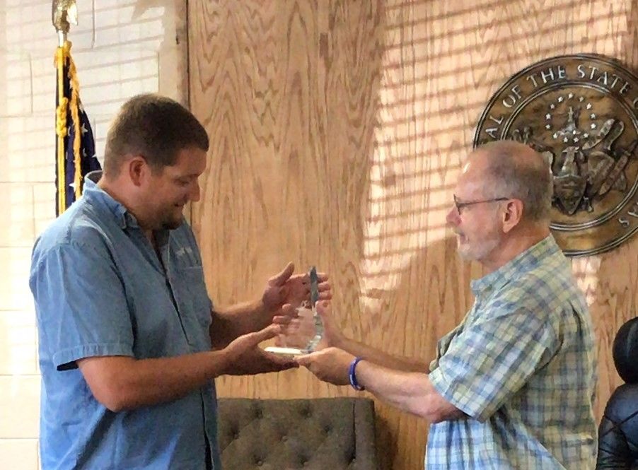 Mayor Caradine presents Justin Morrow with a 15th Anniversary plaque for his "Exceptional Supervision, Outstanding Commitment and Dedicated Service" to the City of Cotter. Justin has worked for the City from 2004-2019.