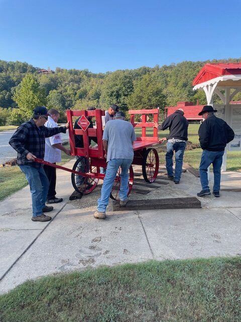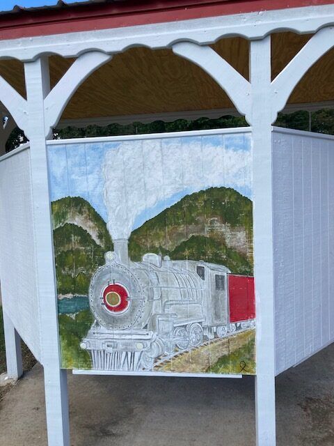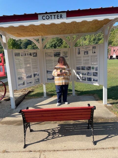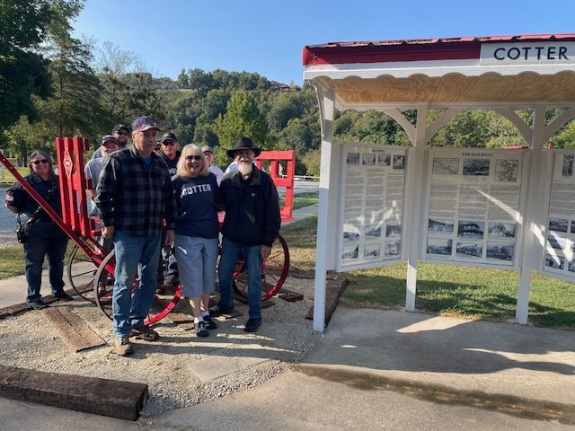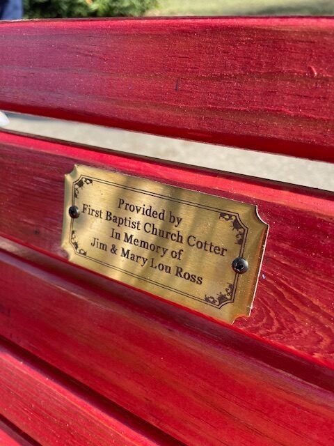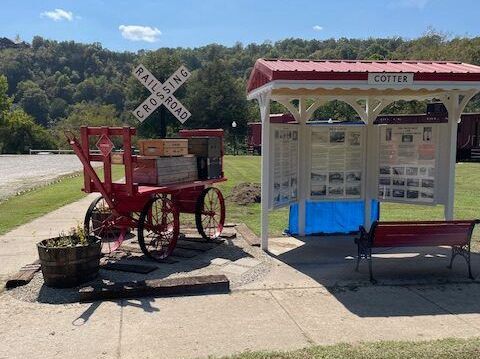 Thanks to the Cotter Care, Crew Joe Ross and Joe Bass for re-building a new Railroad Directory and refurbishing the baggage cart. Also, thanks to Carolyn Gill (donated the baggage cart), Jan Chipps (rendering of the Train Engine on the back), Emily Kaitz (for the flowers), and Cotter Street Department for their time to volunteer. Thanks to Joe and Joy Ross and First Baptist Church of Cotter for providing the red bench in memory of Jim and Mary Lou Ross.